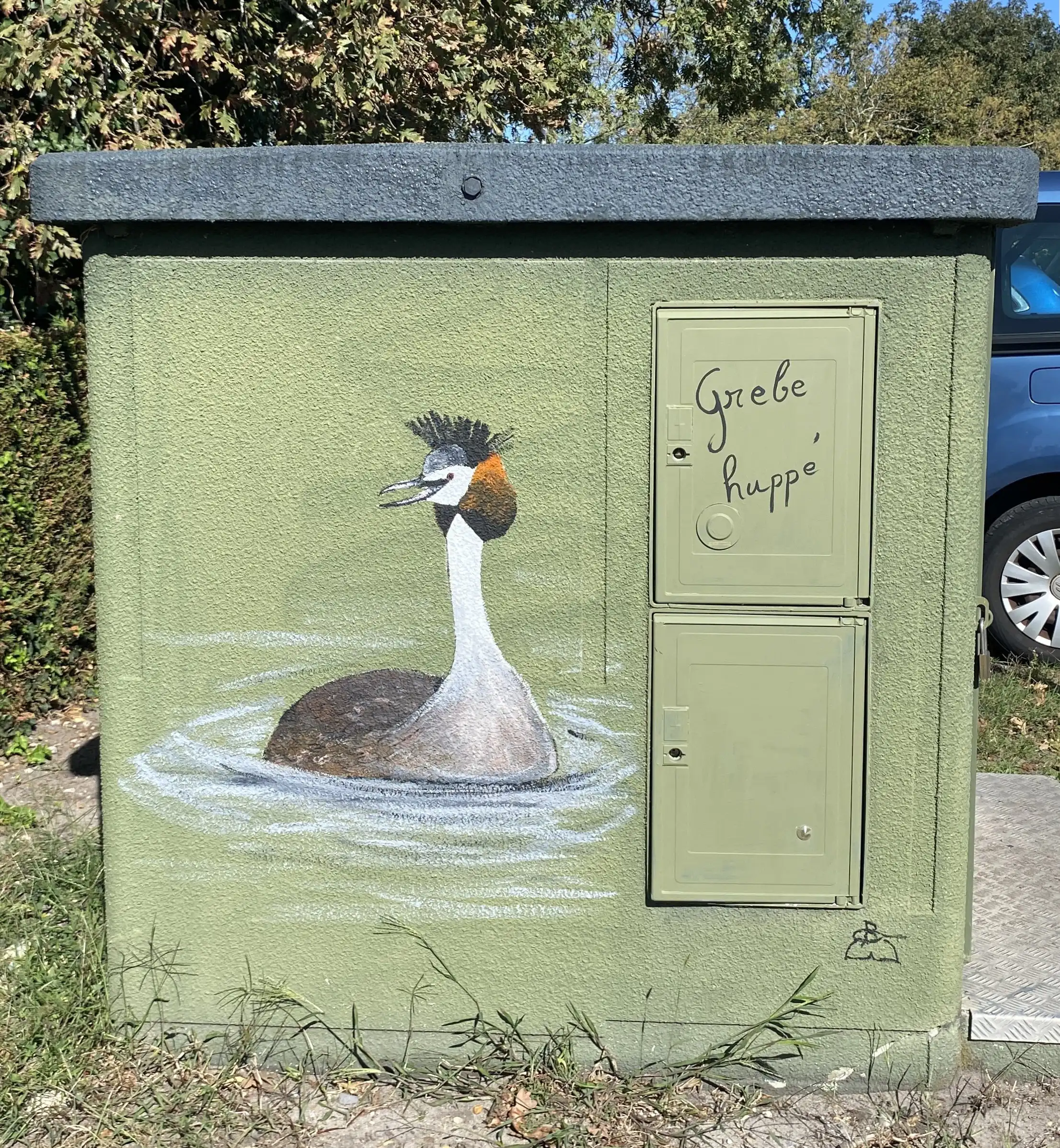 Oiseau aquatique élégant de 46 à 51 cm, au long cou blanc et aux flancs brunâtres. En période nuptiale, il arbore une double huppe rousse et noire encadrant sa tête, ce qui le rend spectaculaire. Son bec est pointu et rosé, parfaitement adapté pour capturer poissons et insectes aquatiques.